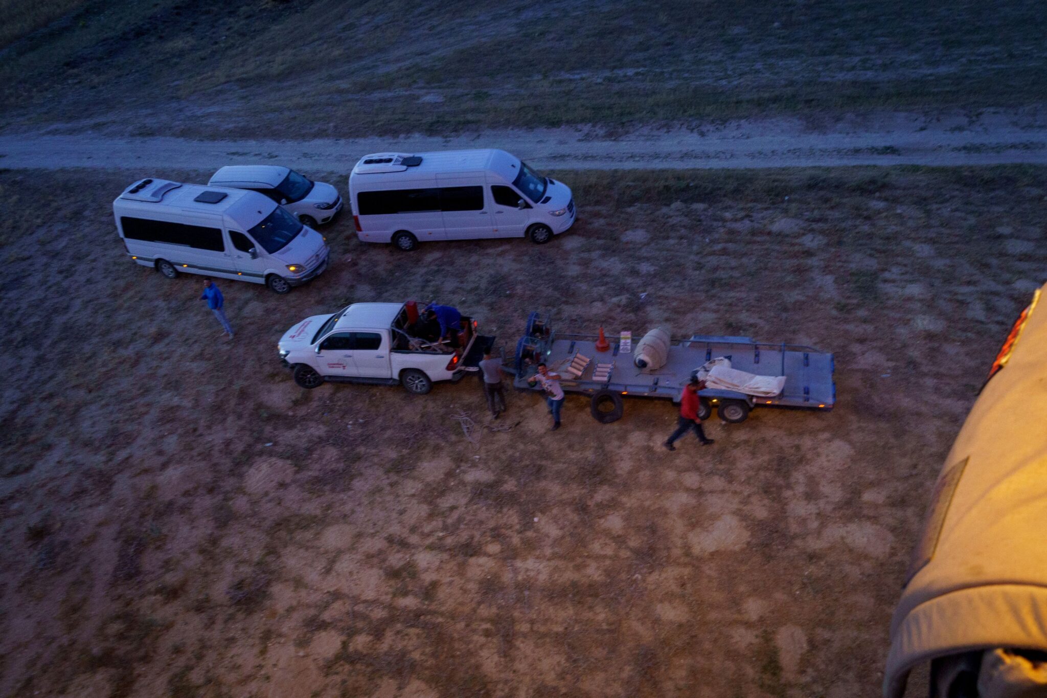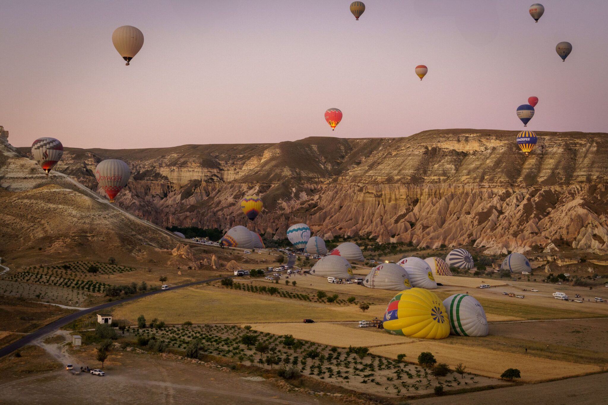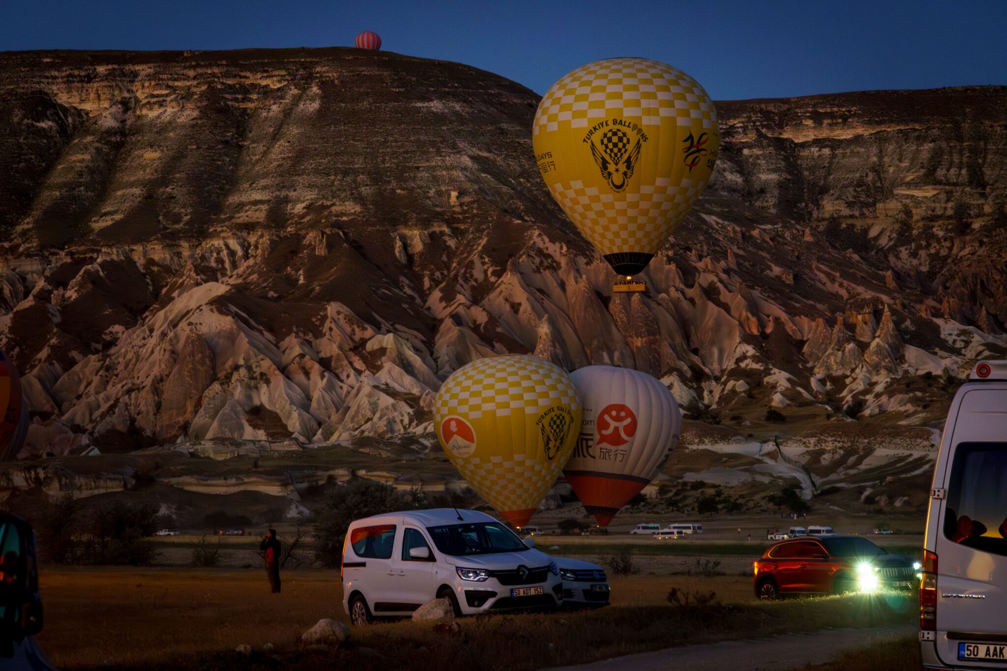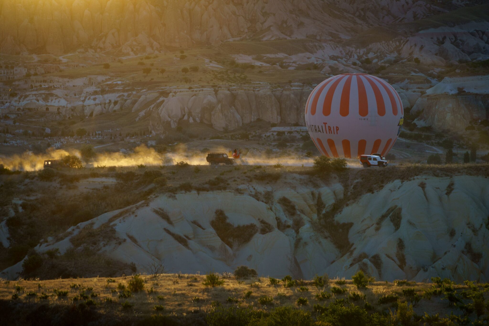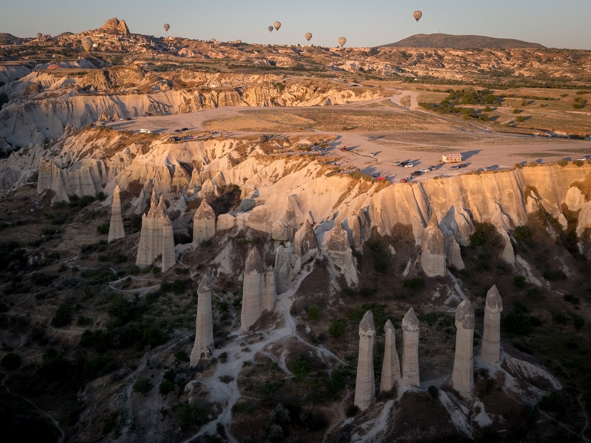 Hajnal 4:45-kor jött értünk a busz, kb. fél órát zötykölődött velünk a felszállóhelyig, ahol már javában fűtötték a ballonokat. Trailer méretű kosarak voltak – erre még visszatérek – 3-4 személyes kis fakkokkal, középen gázzal és a kapitánnyal. Sosem hőlégballonoztam még, csak csodáltam őket, amikor a környéken, csendben siklottak. Nem akarok túlozni, de szerintem száznál is több ballon emelkedett csendben az égbe. Szürkület volt és minden alkalommal, amikor valamelyik kapitány gázfröccsöt adott, a ballonok világítottak, mint egy régi, sárgás villanykörte. Szép lassan emelkedtünk, profin kezelték őket. Felvittek egész magasra, hogy minél tisztábban láthassuk a napkeltét. Pazar volt. Aztán leereszkedtünk a Szerelem-völgybe, olyan közel navigált az ember a hatalmas fallikus szimbólumokhoz, hogy meg lehetett érinteni a végét! Visszaemelkedtünk, gyönyörködtünk a tájba, majd szép lassan leszálltunk. A kosár azért trailer méretű, mert azon szállítják. Onnan indultunk és arra is szálltunk le. Igen a trailerre tette rá a figura. Ami mozgott alatta. A pickupok a trailerekkel a landingzone-hoz mennek és ügyesen a mozgó ballon alá lavíroznak és tűpontosan azon landolt a ballon. Elképesztően ügyes! A végén még egy kis pezsgőt is kaptunk, illetve itt is megdögönyöztem egy újabb random ebet 🙂 Az egész szervezés-lebonyolítás – németeket megszégyenítően – profi, szervezett és lean volt. 7 órakor landoltunk, fél nyolckor már a szálláson vártuk a reggelit. Így utólag megérte volna a négyszeres árat is…..