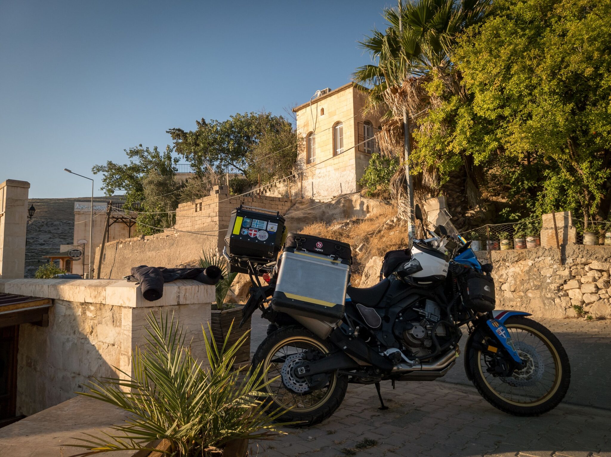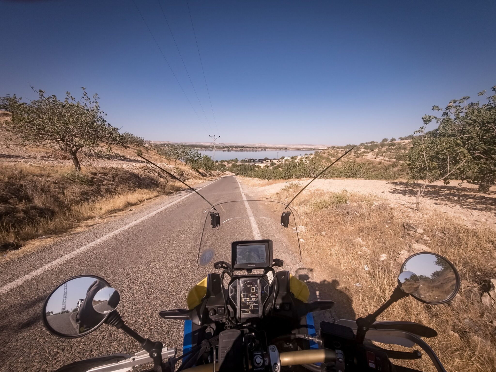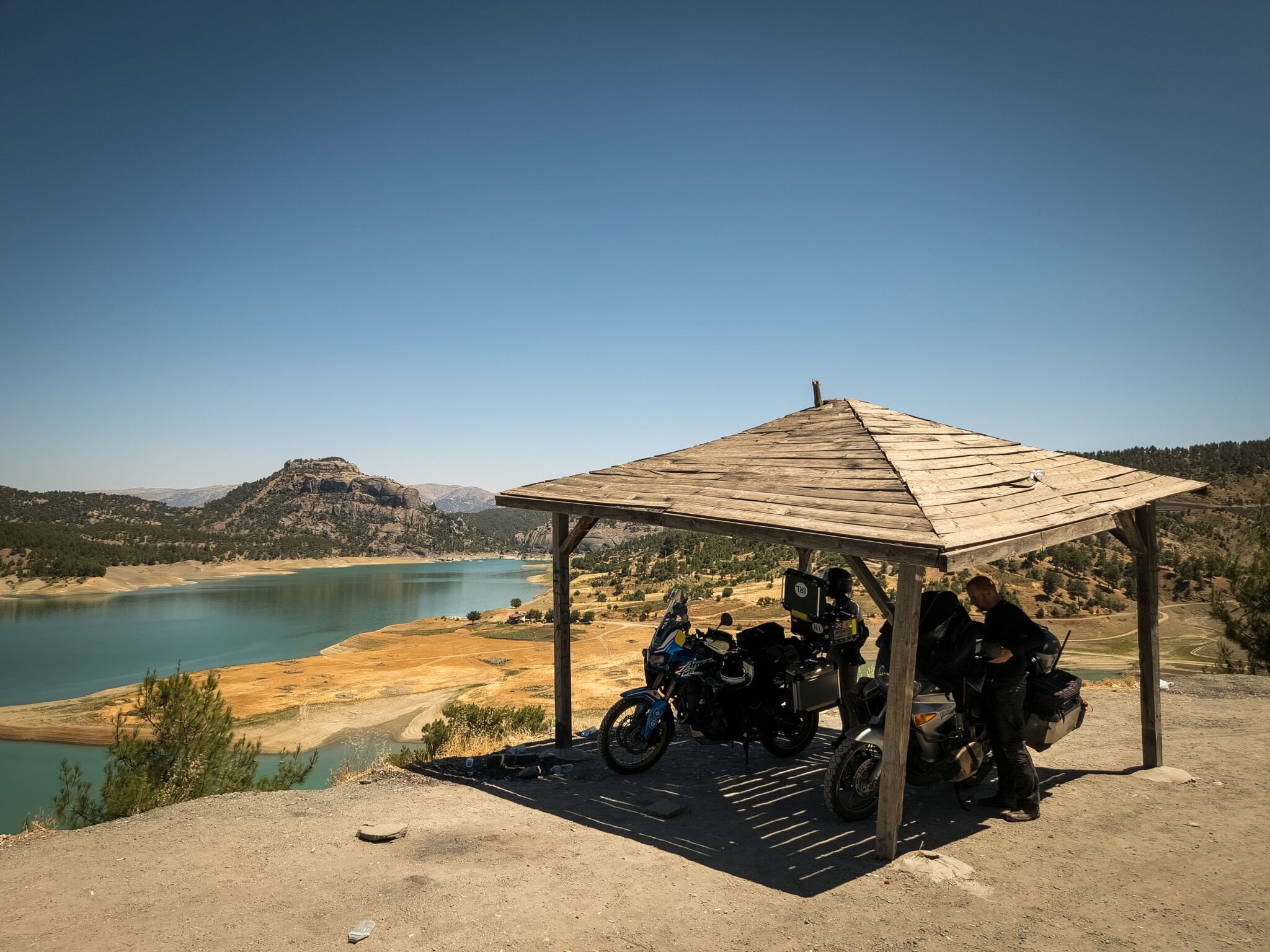 Kis kitérőt azért tettünk a hegyekbe, csak aszfalton. A Menzelet-víztározó egyik kilátópontjához mentünk fel, ami gyönyörű volt, de a nagy meleg elég sokat rontott az élvezeti értékén. Szerencsére találtam egy kis árnyékot, ahol kicsit lehűtöttük magunkat. Ahogy laposodtak a hegyek, egyre melegebb lett és ahogy közeledtünk Gaziantephez, a forgalom is kezdett nőni. A kútnál voltak kis irodák, üzlethelyiségek és megint meghívtak teázni, de rajtam kívül senki sem akart forró teát inni abban a melegben. Én azért bevállaltam, ami igen jó döntés volt. 22 fokos, klimatizált irodában hűlhettem egy darabig 🙂