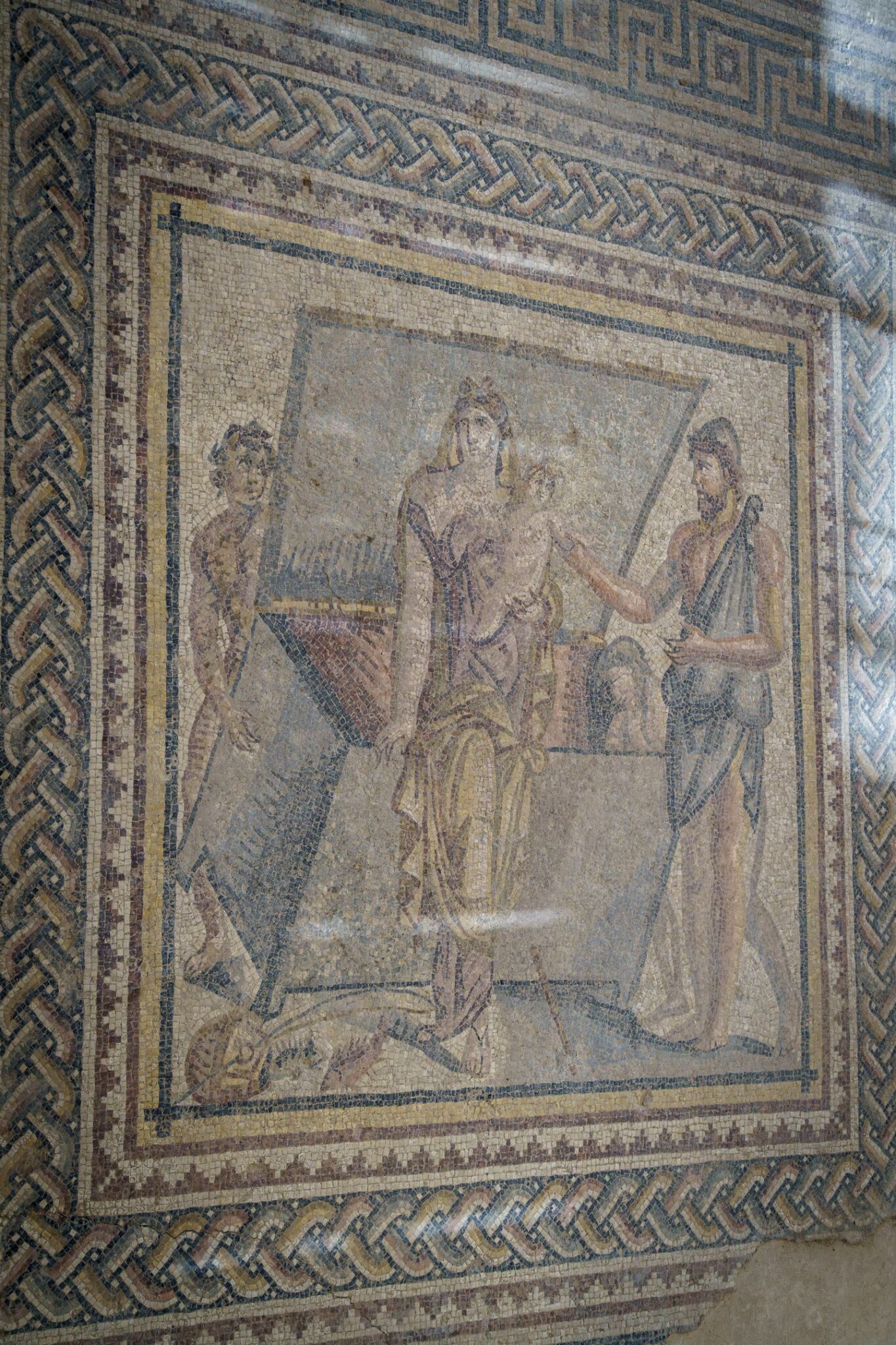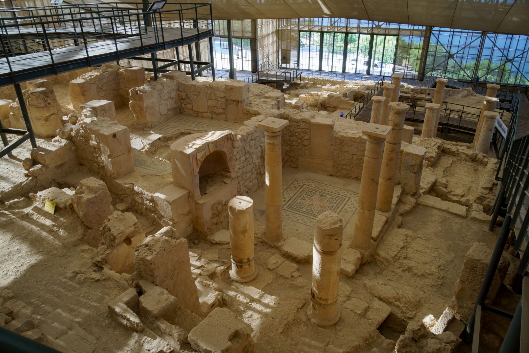 Eléggé el voltunk már csigázva a melegtől. A következő megálló ismét egy ókori város volt, csak most az Eufrátesz partján, Mezopotámiában. Ez sokkal kisebb volt, halandók – nem urak – lakták, de nagyon szép állapotban megmaradt mozaikokkal van tele. UNESCO világörökségi helyszín! Kis látogatóközpont is van, büfével. Oda vezetett az első utunk, vételezni valami jéghideget. A pincérek aranyosak voltak és odatoltak nekünk egy köbméter méretű ipari klímát és ránk irányították! A site szép volt, fedett, legalább árnyékban voltunk.