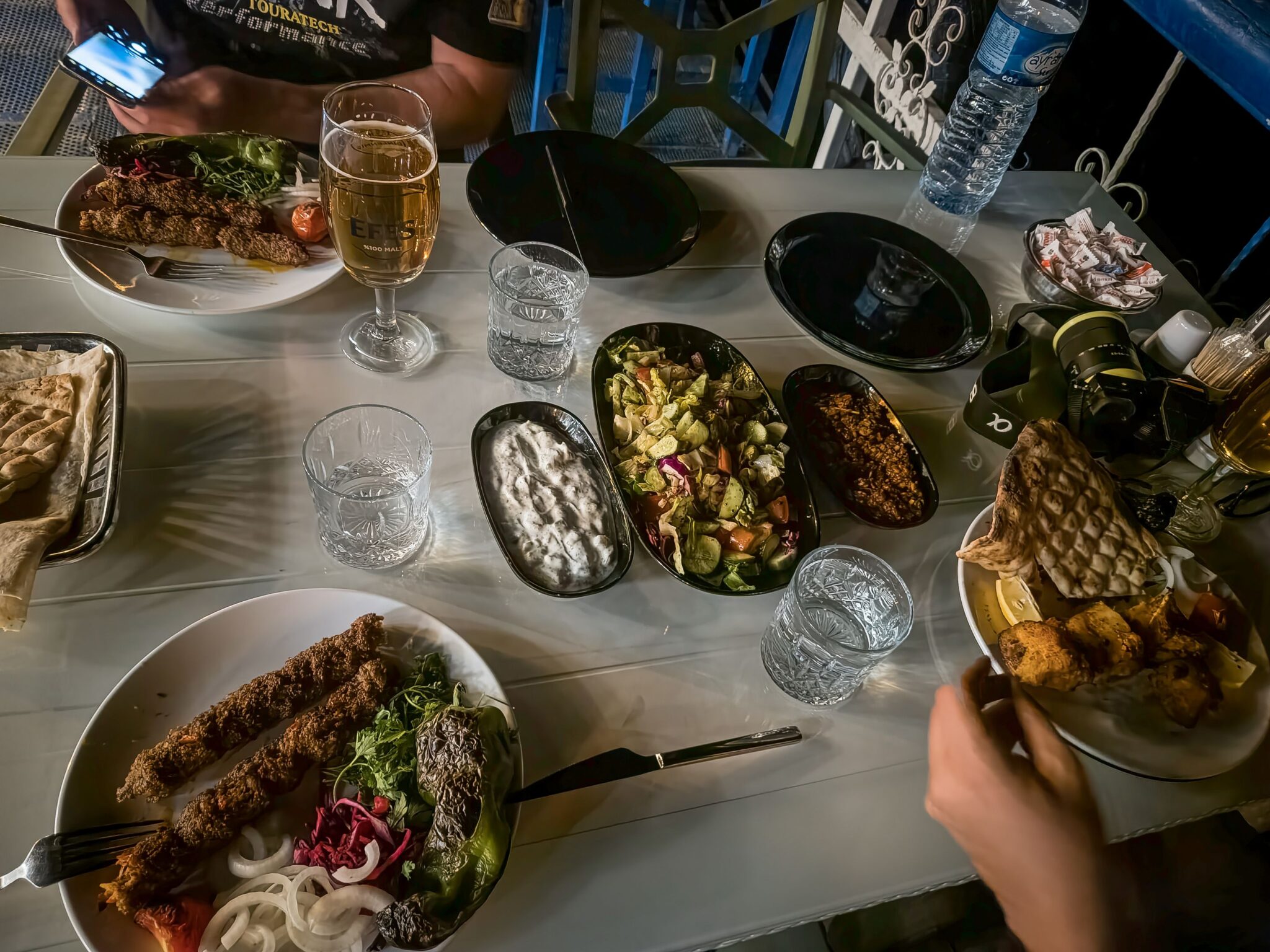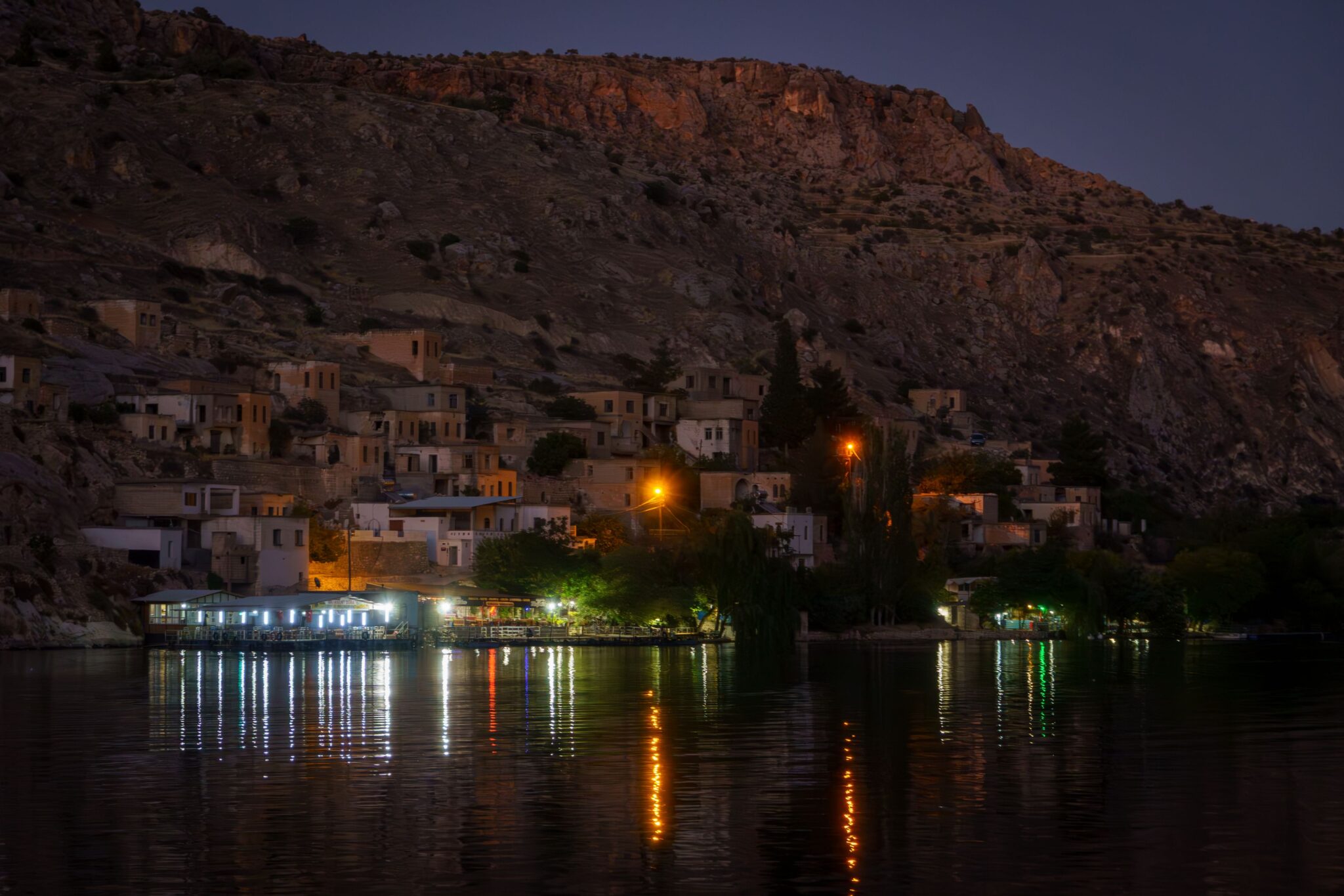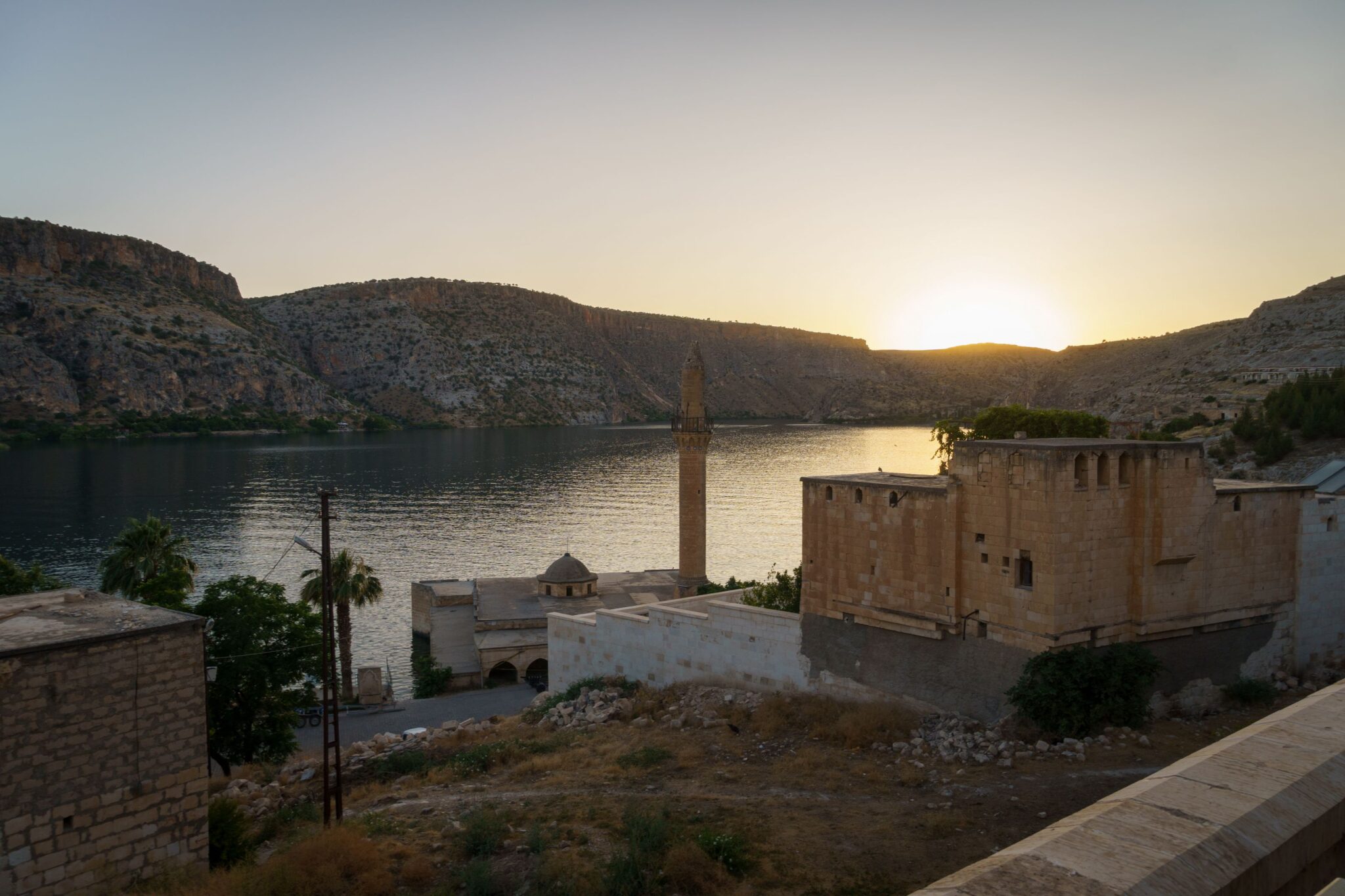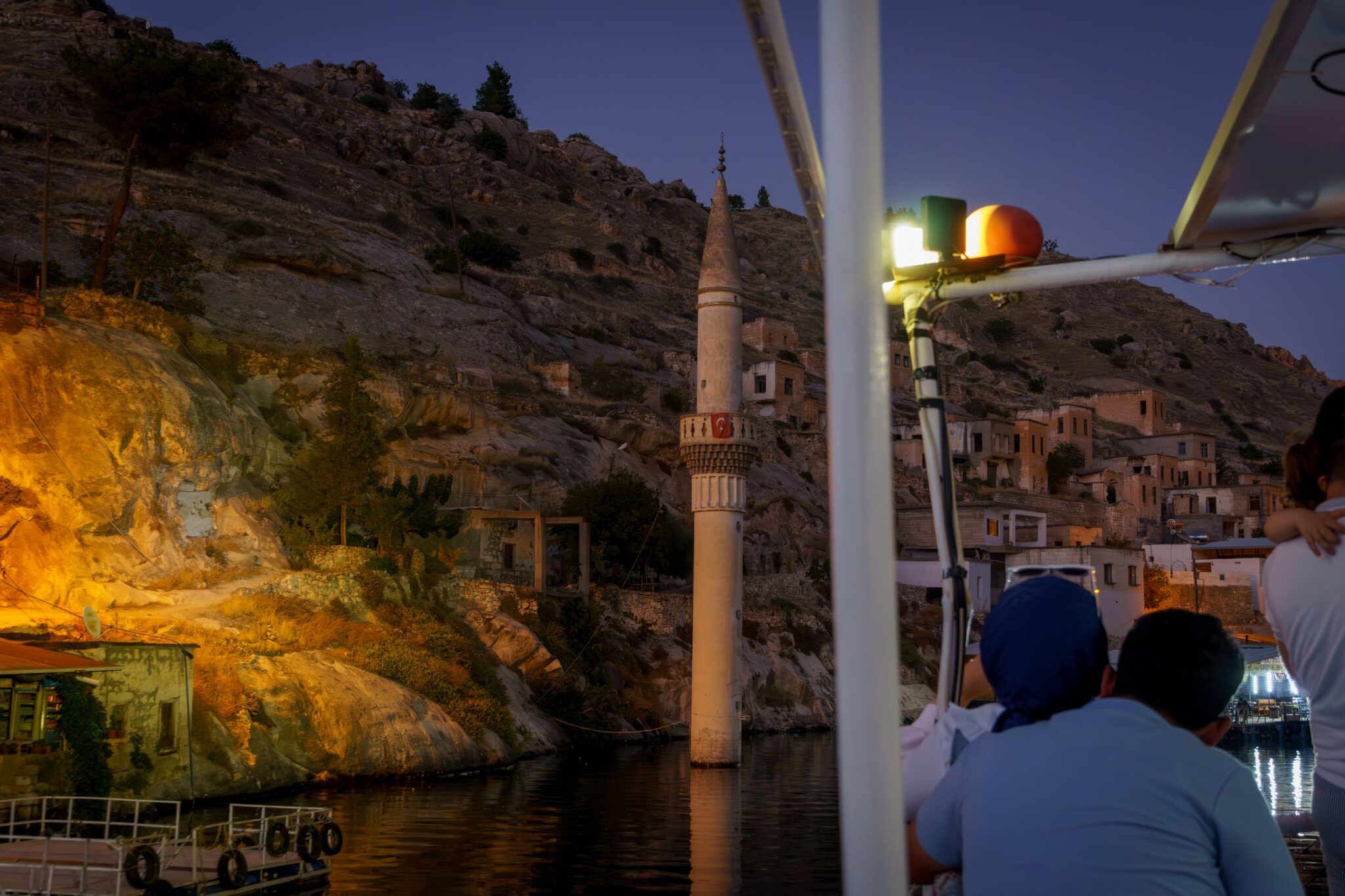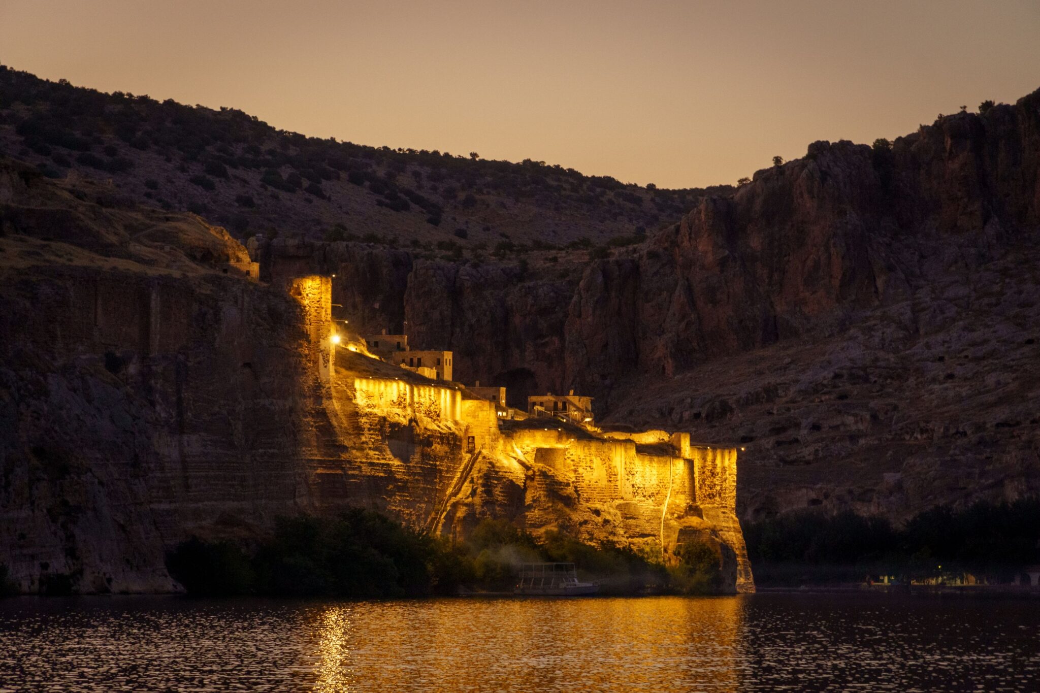 A szállás igen pazar volt, talán az egyik legjobb, ráadásul olcsó is. (errefelé nem nagyon látni utazót). Átöltözés, hideg zuhany és szaladtunk a hajóhoz. A menetrend olyan, ha van elég ember még elindul. Szerencsére volt. Épp a naplementében, ami plusz hangulatot adott az egészhez. Az erőd és a kanyarulat pazar volt és utána még elvittek a gaziantepi elárasztott faluhoz, ahol nem egy templomtorony, mint Bözödújfalun, hanem egy minaret ágaskodik ki a vízből… Itt volt egy rövid kis megálló, vételeztünk sört és már csorogtunk is vissza a kikötőbe. Egy szimpatikus étteremben még degeszre ettük magunkat – én megkóstoltam az eufráteszi őshonos halat: a Shabut-ot! A szállásadó még ébren volt és meg is kínált a saját vörösborával, ami egészen jó volt. Ezen a vidéken asszírok (szír-ortodox keresztények) élnek, akik a mai napig beszélik az arámit, Jézus nyelvét. Az ő borkultúrájuk világhírű és több ezer éves hagyományra tekint vissza – így amit ittam, az szó szerint a történelem egy darabja volt. Mikor elcsendesedtünk, vettem észre, hogy a sakálok, mint nálunk a tücskök nyáron, úgy vonyítottak minden irányból. Csak sokkal több! Hátborzongató volt.