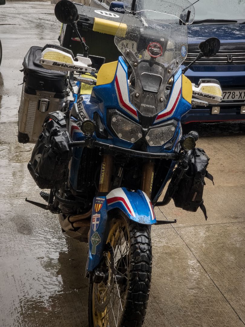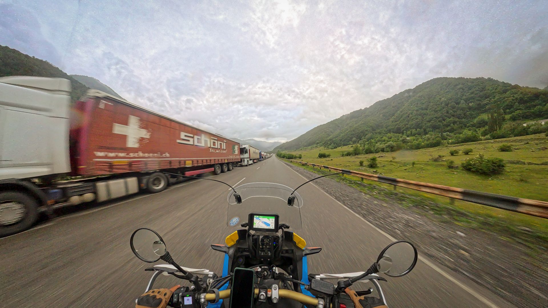 Az út 100 kilométeren kétezret emelkedik, majd ismét lesüllyed 1.300-ra, az orosz határra. Nagy volt a forgalom, nagyon sok teherautó, akik ugyancsak semminek néztek, mint az autósok. Simán rád húzzák a vontatmányt. Az első kanyargós szakasz után egy fennsíkon folytattuk, ahol – nem akarok nagyon nagyot mondani – vagy 20-25km-es kamionsor várta az orosz határt. Mindent is vittek, amit Európából nem szabad…. Még feljebb újra esni kezdett és kétezer felett már hideg is volt, mindennek mondanám, de nem motoros időnek. De mi kemények vagyunk. Végül – kis megállóval – 2 óra alatt elértük a hadiút végét!