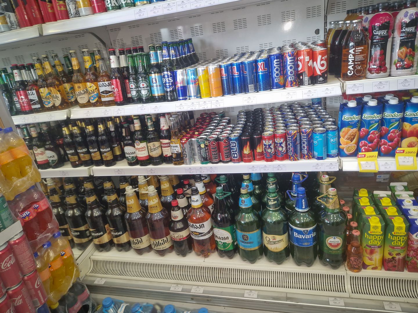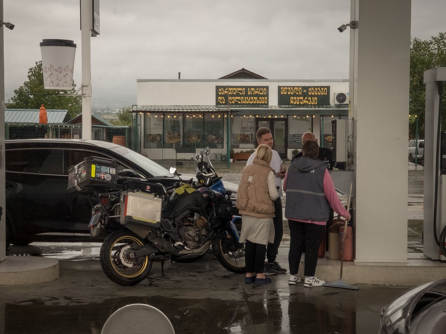 Végre találtam egy értelmezhető benzinkutat. Értsd úgy, hogy talán van meleg tea és kávé. A kutasok kedvesen voltak, kaptunk forró italokat meg hősugárzót. És láss csodát, a kút tele volt a legkülönfélébb sörökkel és ráadásul emberi áron 😀 Amíg megmelegedtünk, az eső is elállt.