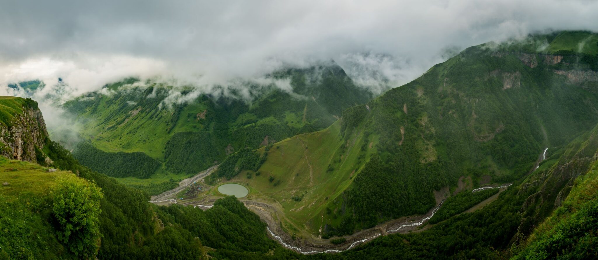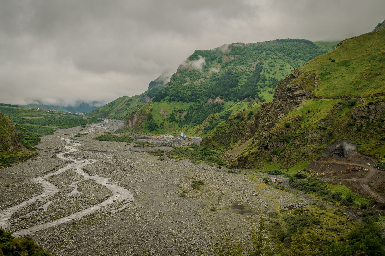 A térlép szerint szép, szerpentines szakasz vezetett le a Mtkvari völgyébe. Kikecmeregtünk a szálloda, teljesen felázott, frisset feltúrt bekötőjéről – tényleg szügyig süllyedve. A városban alig volt út. Mindenhol építkezések, szállodák, resort-ok és a hozzájuk kapcsolódó közművek. Minden fel volt túrva. 2-3 év múlva nagyon pazar lesz! A szerpentin szép volt, nem is volt annyira rossz az út, de az eső miatt mindenki szuttyogott, és a vizes úton azért nem lehetett úgy előzgetni, hogy jó legyen. Leértünk a völgybe, keresztülmentünk Khashurin-n, ami ugyancsak fel volt túrva, le volt minden zárva. A munkások a motorral simán beengedtek az építési területre, csak épp kijutni volt nehéz. Dagasztottuk itt is a sarat rendesen. Az eső csak úgy ömlött.