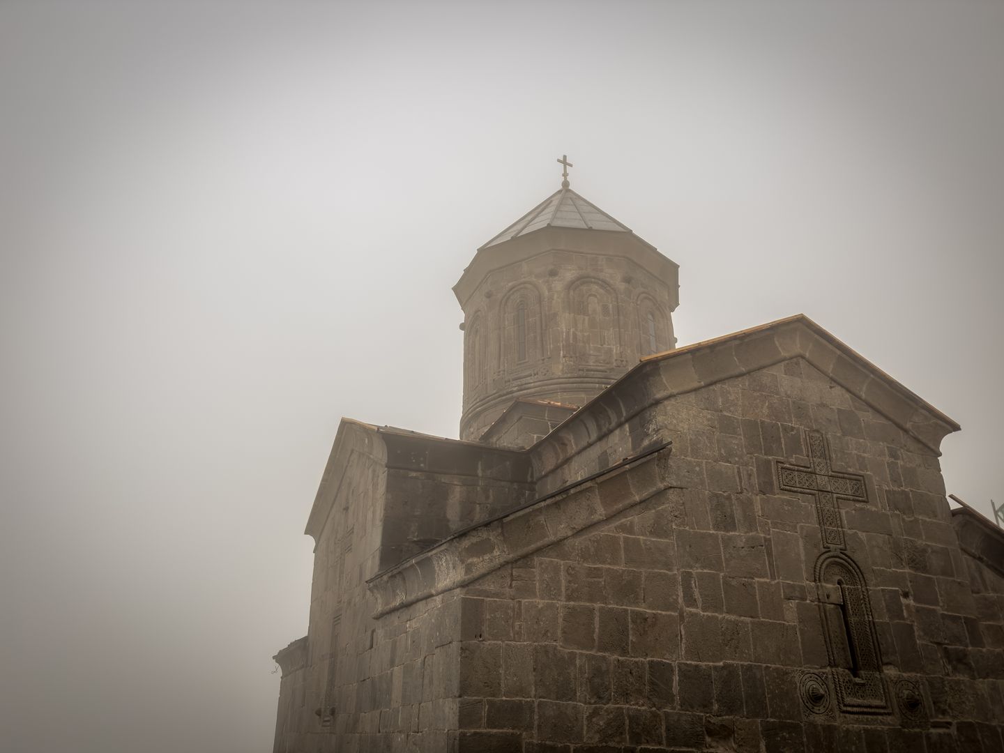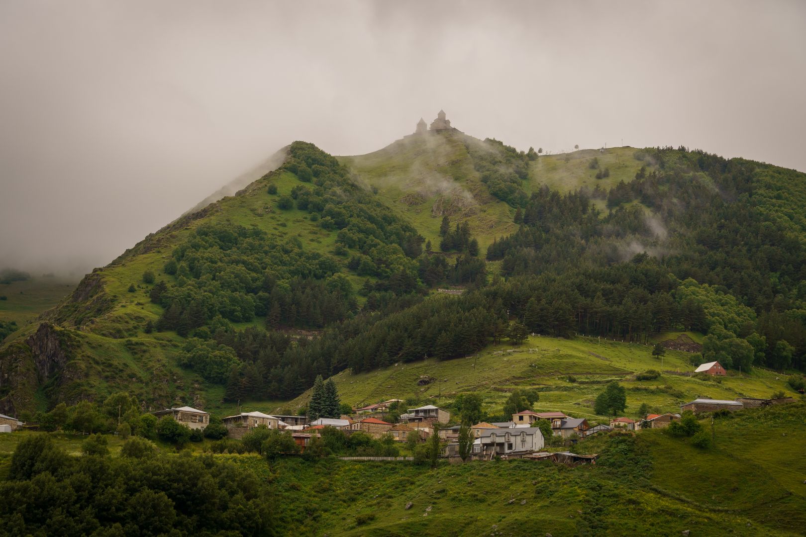 Az orosz határra elállt az eső, kicsit körbenéztünk és mentünk is vissza a Gergeti kolostorhoz. Ködben úszott, csak időnként kandikált ki. Szép meg érdekes volt, de szerintem nem túl nagy durranás, ha választanom kellene mit nézzek meg Grúziában nem ezt lenne az, ahogy az orosz hadiút sem.
