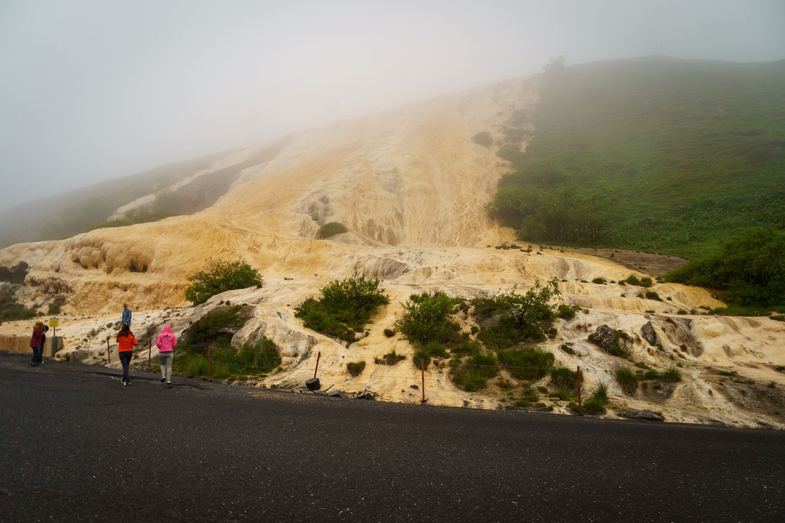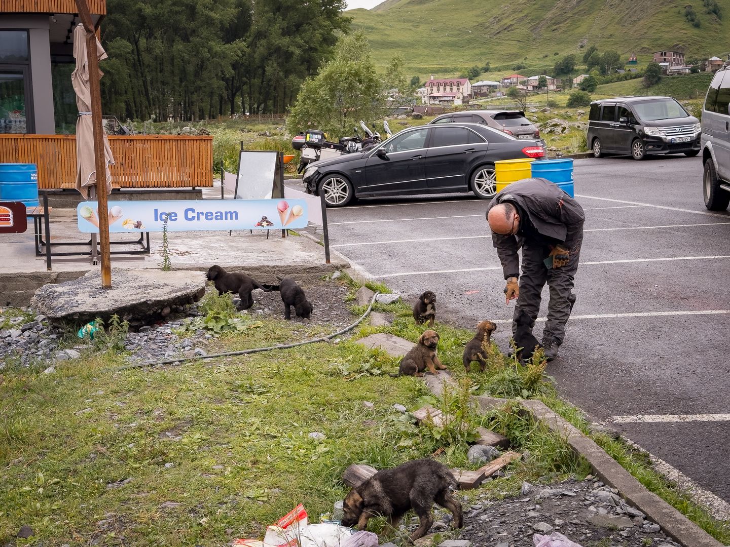 Lent a parkolóban egy streefood-osnál jól bekajáltunk, meggyöntöltem egy kölyökkutya hadat. Közben már kezdett felszáradni, de mi teljesen át voltunk fagyva. Hiába a jó esőruha, a pára, az eső, a hideg szép lassan kihűt. Rengeteg, jobbkormányos Mitsubishi Delica-t láttunk. Ezekkel hozták ide, a Gergetihez a sok turistát. Azokból is az izmosabbak, 3 literes, V6-os benzinmotorokkal, automata váltóval és összkerékkel az úttalan utakra. Mentek, mint az olajozott istennyila. Visszafelé a hágón észre vettük a grúz Pamukkalet. Odafele az esőben és a ködben fel sem tűnt. Mondjuk most nem volt kedvünk fürdeni 😀