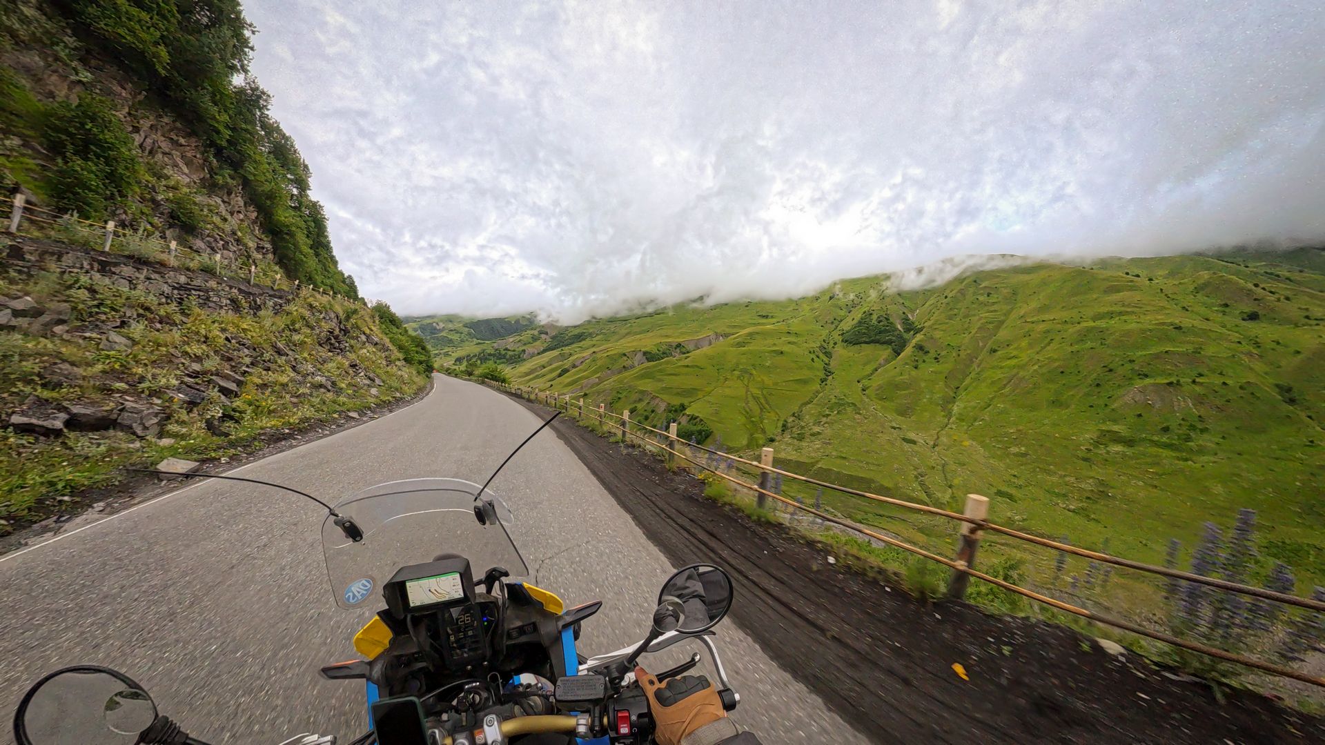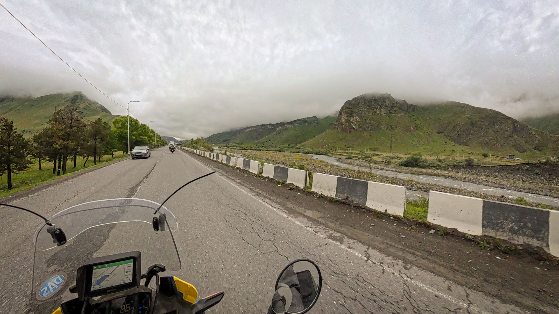 Mivel ömlött az eső (ezt írtam már?), felcsattantam az autópályára Tbilisi felé, hogy minél inkább szemből kapjuk az áldást. Tbilisi-nél eltévedtem a furmányos le és felhajtó közt (sose szoktam – kivével a szokásos Bolzanót!) és meglehetősen sokszor ki szerettek volna nyírni az autósok. De nem csak a jól ismert agresszív B*sek, hanem a szedált Priuszosok is! Nem mondanám motoros barát vidéknek. Pedig szeretem a káoszt, a nápolyi kavalkádot kifejezetten élvezem.